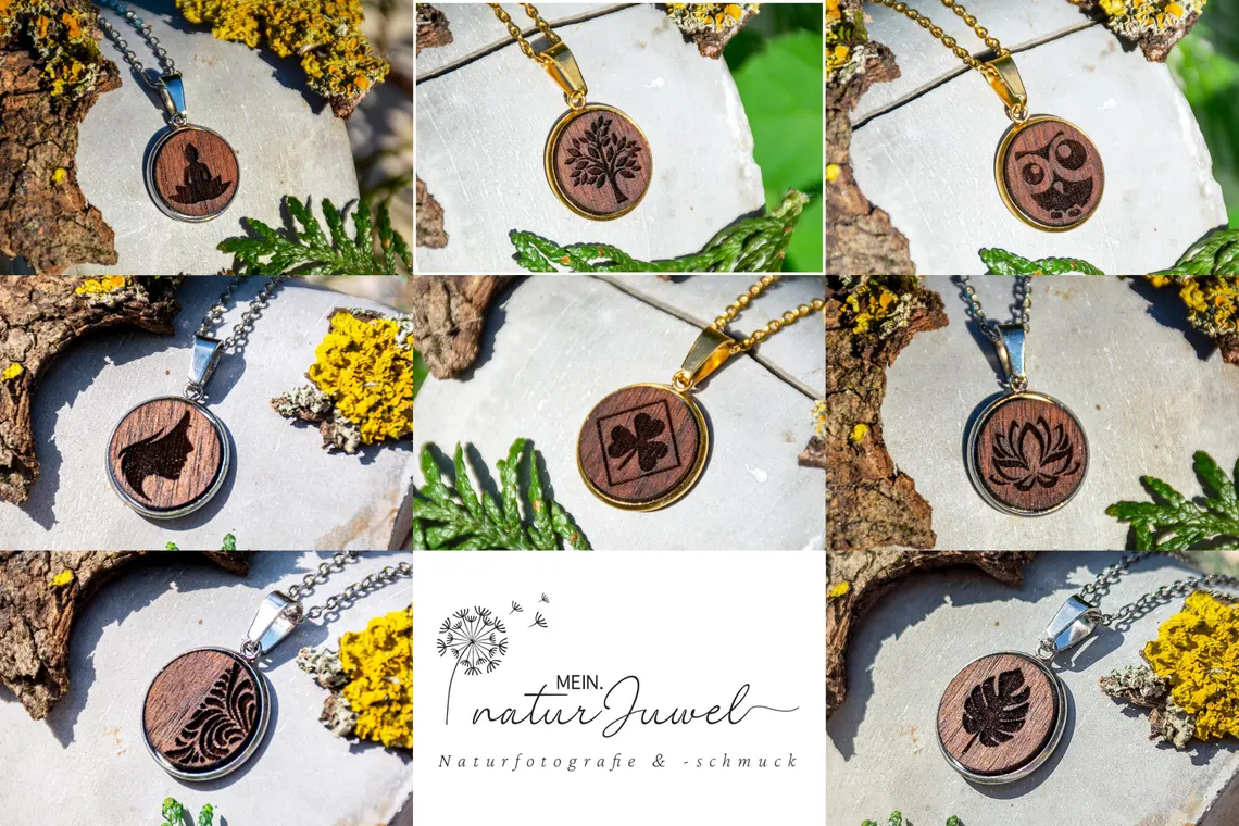 Warme Holztöne, feine Linien, leuchtende Symbolik – dieser Schmuck aus Walnussholz verbindet Natürlichkeit mit Bedeutung.